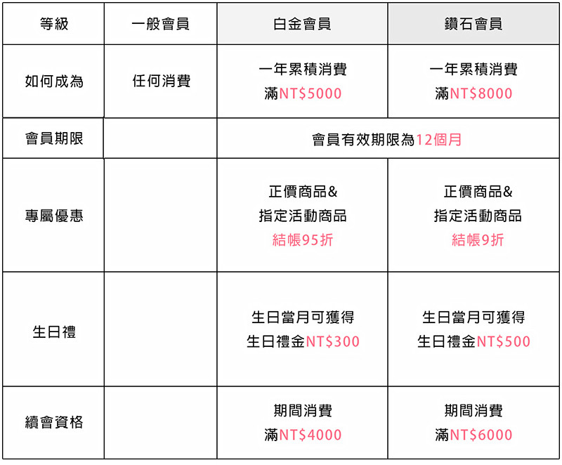 【VIP】同一帳號,一般會員,累積消費滿5000元,VIP資格將為期一年,期間消費滿4000元,可延用一年。